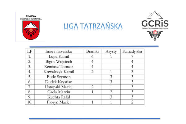 Zawrat: Bużek 3, Gutt 3, Papież 3, Ustupski 4, Grela G 3, Łukaszczyk 3, Rzadkosz 4, Grela M 4.